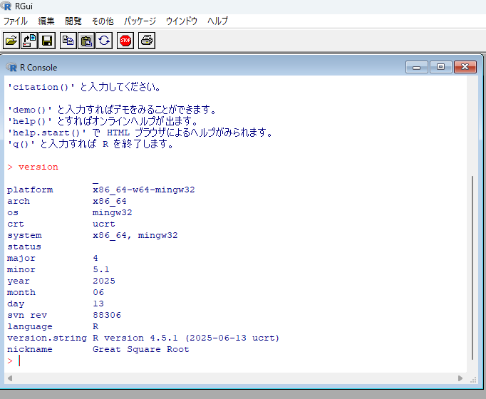 4.3.2をインストールしたので、4.3.2を起動してみます。Rのフォルダの中に「binフォルダ」に入っています。x64フォルダのなかのRgui.exeをクリックしたら起動します(不確かですが、32bit のPCはたぶんx32になると思われます)。