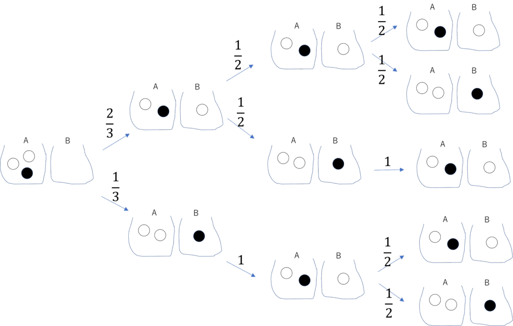 袋Aに白玉2個、黒玉1個あります。袋Bは空です。 袋Aから一つ取り出して、袋Bに移します。 その後、袋Aの1個と袋Bの1個を入れ替えます。 さらに、袋Aの1個と袋Bの1個を入れ替えます。 袋Bに黒玉が残る確率を求めよ。