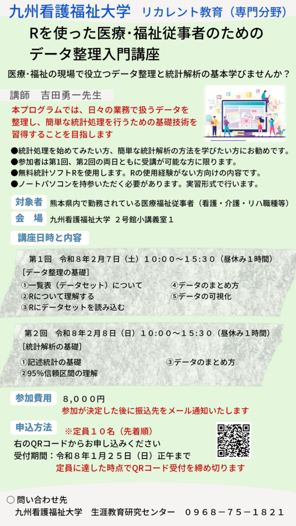 熊本県内限定!「Rを使った医療・福祉従事者のためのデータ整理入門講座」のお知らせ Rの関数 2026.01.09 下記のリンクからもお申込みいただけますRを使った医療・福祉従事者のためのデータ整理入門 申込受付用